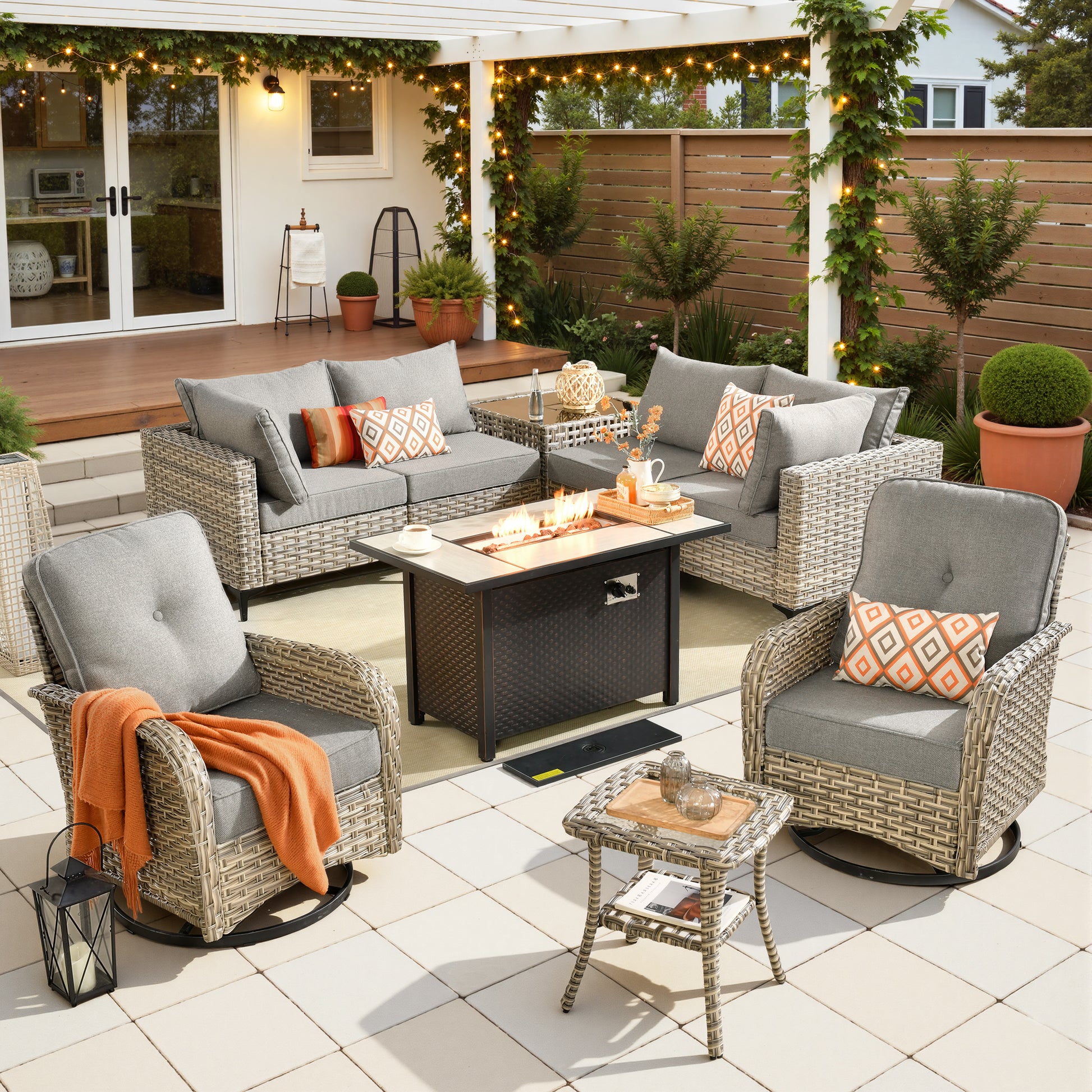Toject 11 Pieces Patio Furniture Set Outside Furniture Outdoor Patio Furniture with Swivel Chairs, Fire Pit and Solar Coffee table. Toject outside furniture building your outdoor place beauty. Our patio furniture set includes 2 Outdoor Corner Sofa, 2 Swivel Chairs, 4 Center Sofa, 1 52 in Fire Pit, 1 Solar Lights Coffee Table and 1 Side Table. Suitable for creating a outdoor conversation set in your backyard, poolside or patio. While the modular outside sectional sofa (8 seating positions) provides flexible arrangements to suit any space. Crafted from premium all-weather wicker and powder-coated steel frame, this durable outdoor furniture set withstands sun, rain and seasons while maintaining its elegant appearance. Choose from stylish colors to match your outdoor decor, and enjoy plush 3.54 inch cushions with fade-resistant, removable covers for easy maintenance. With 350 lb weight capacity per seat, this versatile swivel patio chairs set combines comfort, style and functionality for your perfect outdoor living area. Pls konw that Items ship in multiple packages that may arrive separately.