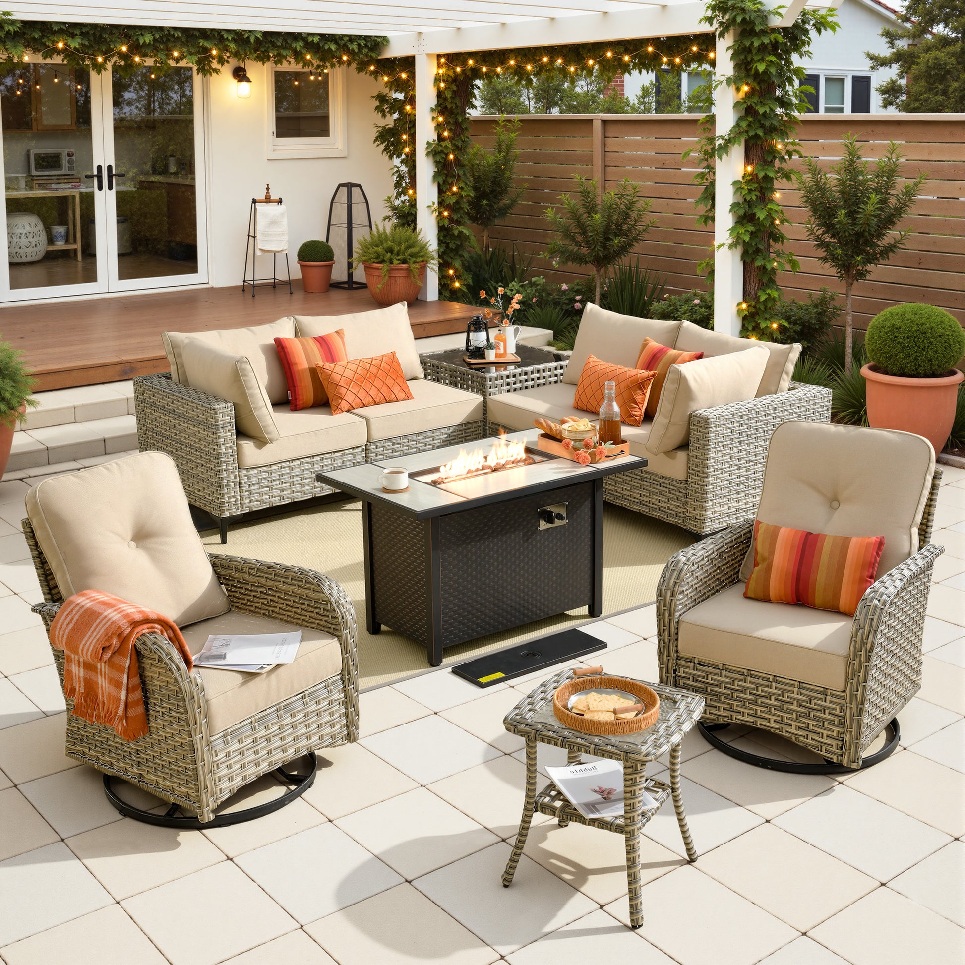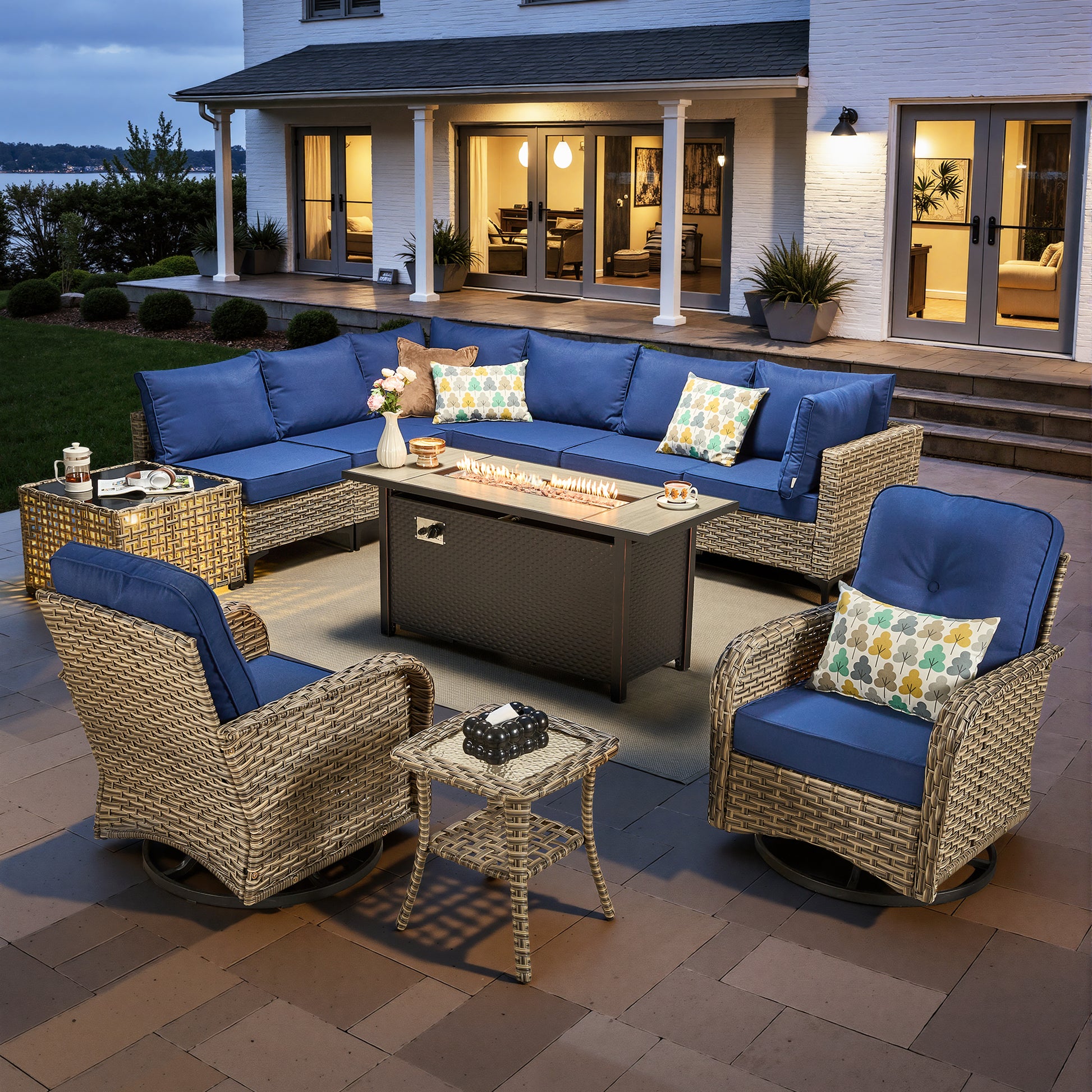 Toject 11 Pieces Patio Furniture Set All Weather Wicker Outdoor Conversation Set with 54" Fire Pit Outside Furniture Patio Sofa with Swivel Chairs & Solar Table